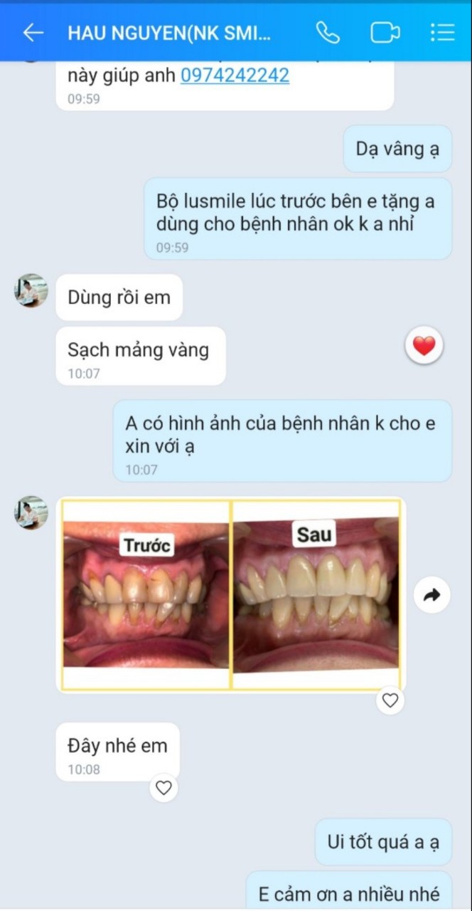 Chỉ sau 15 ngày điều trị bằng Bộ cân bằng vi khuẩn Lusmile TP đã cải thiện được hoàn toàn thẩm mỹ bề mặt răng của bệnh nhân, cụ thể là tình trạng ố vàng trên răng, phần lợi cũng đã hết sưng đỏ. Anh Sơn còn cho biết thêm, sau khi sử dụng Bộ cân bằng vi khuẩn Lusmile TP để đánh răng hàng ngày, hơi thở của anh cũng có mùi dễ chịu hơn, không còn mùi hôi của thuốc lá như trước đây.