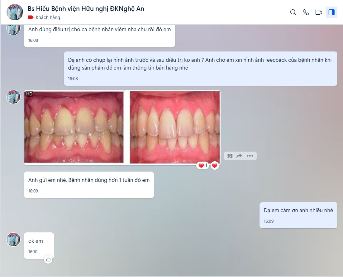 Bs. Hiếu15:08 - 29/11/2023Khách hàng nói về chúng tôi, Bệnh nhân bị viêm lợi nhẹ, sử dụng bộ cân bằng vi khuẩn Lusmile sau 7 ngày đã khỏi viêmChia sẻ: