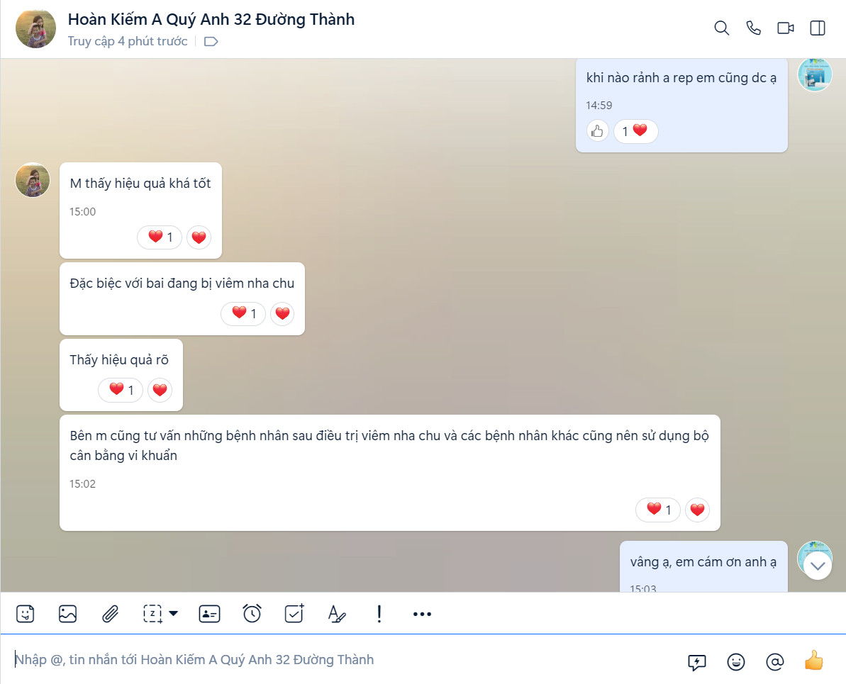 Hiệu quả khá tốt, đặc biệt với ai đang bị viêm nha chu. Bên mình đang khuyến khích các bệnh nhân sau khi điều trị viêm nha chu duy trì sử dụng Bộ cân bằng vi khuẩn Lusmile tại nhà.