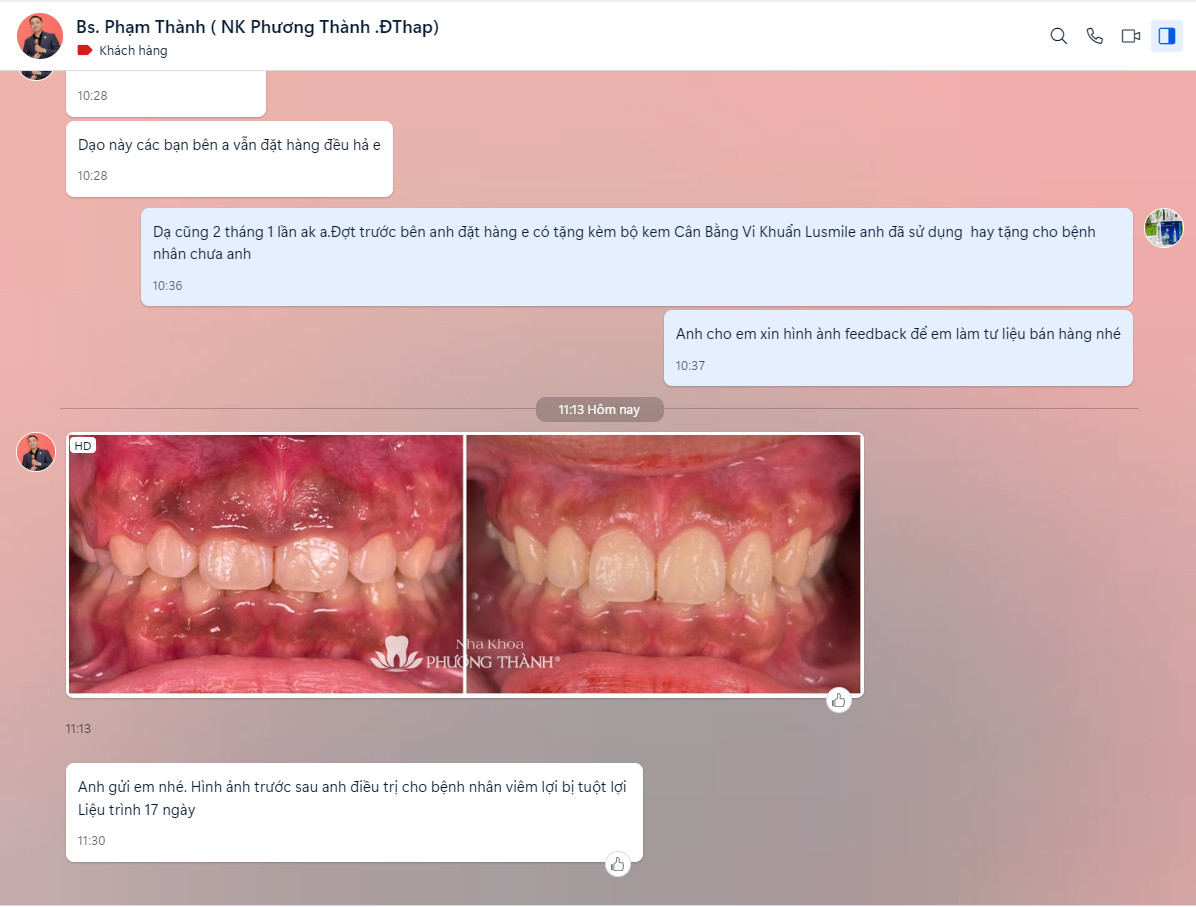 Sau khi thăm khám và tìm ra nguyên nhân khiến chị Lân bị tụt lợi nặng, bác sĩ đã tiến hành lấy sạch cao răng và giải quyết viêm bằng cách sử dụng Bộ cân bằng vi khuẩn Lusmile TP. Ngoài ra, bác sĩ còn đưa cho chị Lân một bộ sản phẩm Cân bằng vi khuẩn Lusmile để tự điều trị tại nhà.