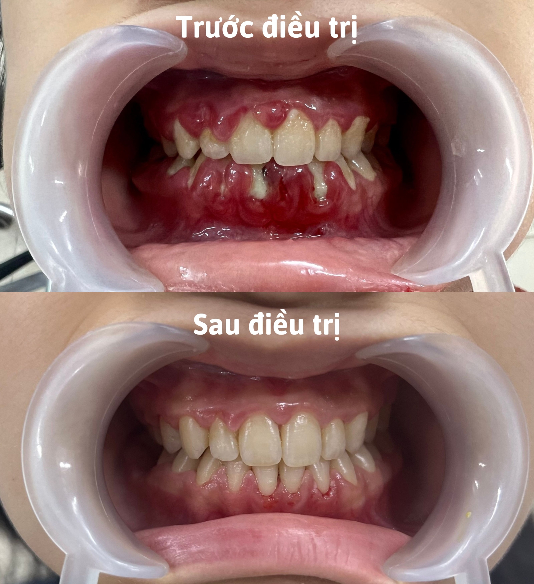 Sau khi đến nha khoa và được bác sĩ tư vấn hướng điều trị, bệnh nhân đã được bác sĩ vệ sinh khoang miệng sạch sẽ, sau đó sử dụng bộ cân bằng vi khuẩn Lusmile để điều trị viêm lợi cho bệnh nhân. Sau 2 tuần cách 1 ngày đến nha khoa để chải răng 1 lần bằng Lusmile, kết hợp với uống kháng sinh chống viêm, hiện tại tình trạng răng của bệnh nhân đã phục hồi được đến 95%. Một số răng bị viêm phì đại quá nặng nên phần lợi vẫn còn vết thương hở chảy máu, bác sĩ hẹn bệnh nhân điều trị thêm bằng Lusmile trong 1 tuần nữa để tình trạng viêm được chữa khỏi hoàn toàn.