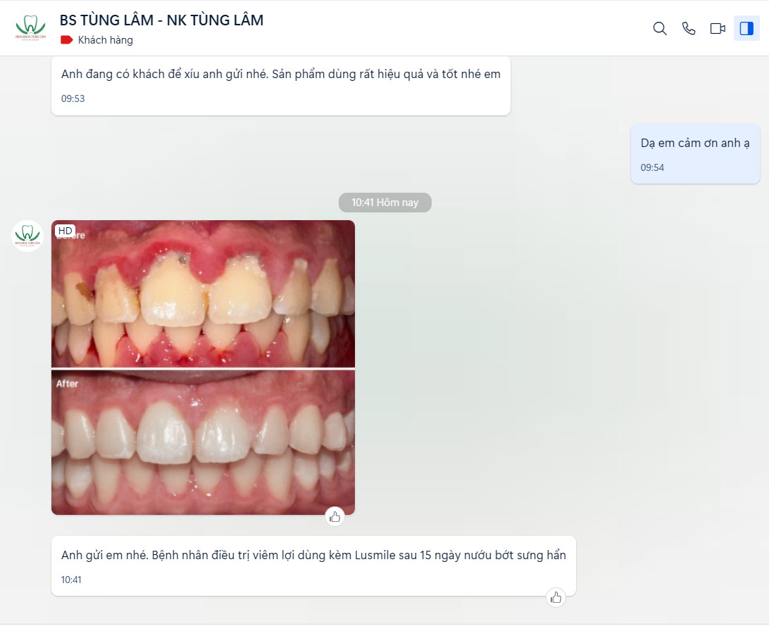Bác sĩ sau khi kiểm tra tình trạng răng của anh, đã tiến hành lấy cao răng, làm sạch mảng bám trên thân răng và dưới nướu, nạo bỏ ổ mũ tại các kẽ viêm. Sau đó bác sĩ sử dụng Bộ cân bằng vi khuẩn cho bệnh nhân để giúp làm se phần nướu đang bị tổn thương do viêm, làm săn chắc nướu răng. Chỉ sau 15 ngày điều trị bằng Lusmile, răng của bệnh nhân đã khỏi viêm hoàn toàn, phần lợi đã hết sưng và hồng hào khỏe mạnh.