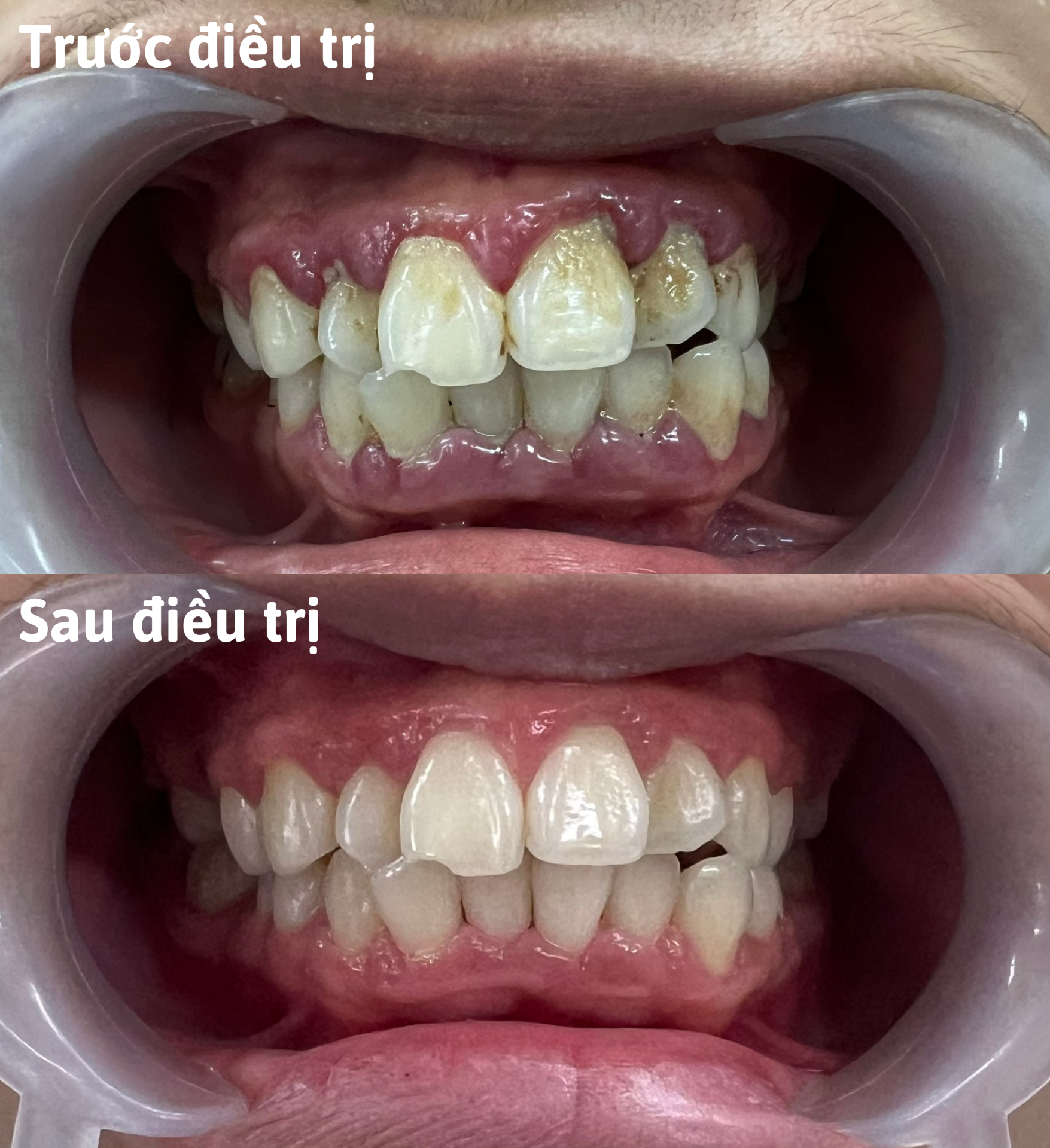 Bệnh nhân đến nha khám răng trong tình trạng răng vàng, nhiều mảng bám, bị viêm lợi nặng, lợi bị sưng phồng, chảy máu chân răng và có mùi hôi khó chịu.