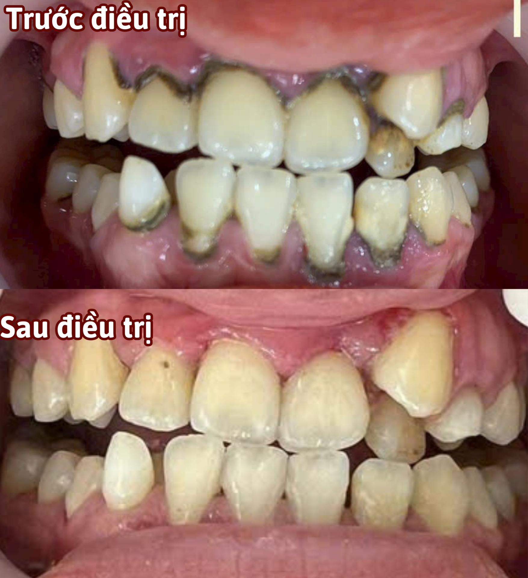 - Cuối liệu trình: không còn chảy máu chân răng, mô lợi săn chắc hơn, vùng hở chân răng ổn định và hơi thở cải thiện rõ